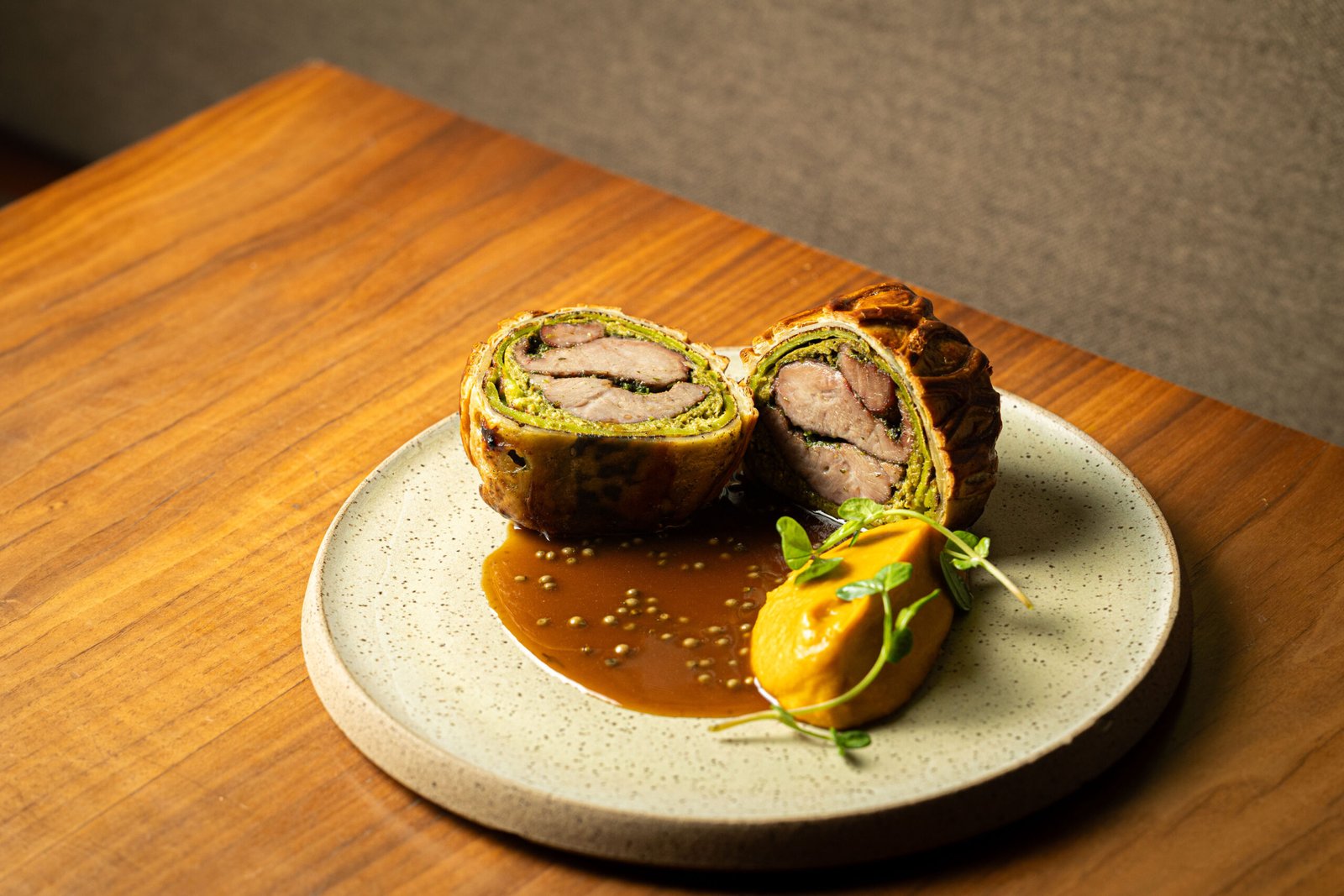 O novo menu também traz preparações que revisitam ingredientes e cortes pouco explorados. Um exemplo é a Codorna assada, servida com farofa de caju e uma releitura mineira da clássica salada Waldorf. Outro destaque é o Wellington de porco, agora preparado com bochecha de porco de longa cocção envolta em massa folhada e servida com purê de abóbora tostada e molho poivre do norte de Minas. “A gente sempre fez Wellington com carnes de ponto, que vão rosadas dentro da massa. Dessa vez resolvemos fazer com uma carne de longa cocção, a bochecha de porco, e o resultado ficou muito interessante”, explica o chef.